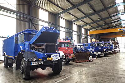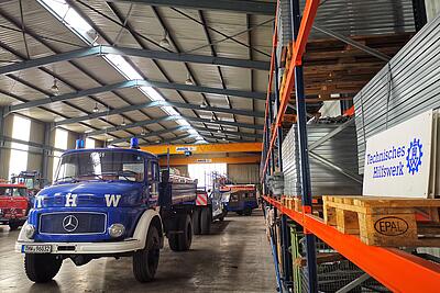 Das Depot bietet viel Platz: 137 Regalmeter bzw. 588 Paletten-Stellplätze sind aufgebaut und 14 Fahrzeuge befinden sich aktuell in der Halle. Neben den historischen Fahrzeugen wie einem MB 1113 und einem MB 407D FeKW umfasst die Sammlung alte THW-Gerätetechnik, diverse Ausrüstungsteile und viele Garnituren historischer Einsatzbekleidung.