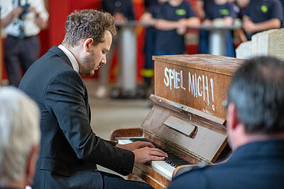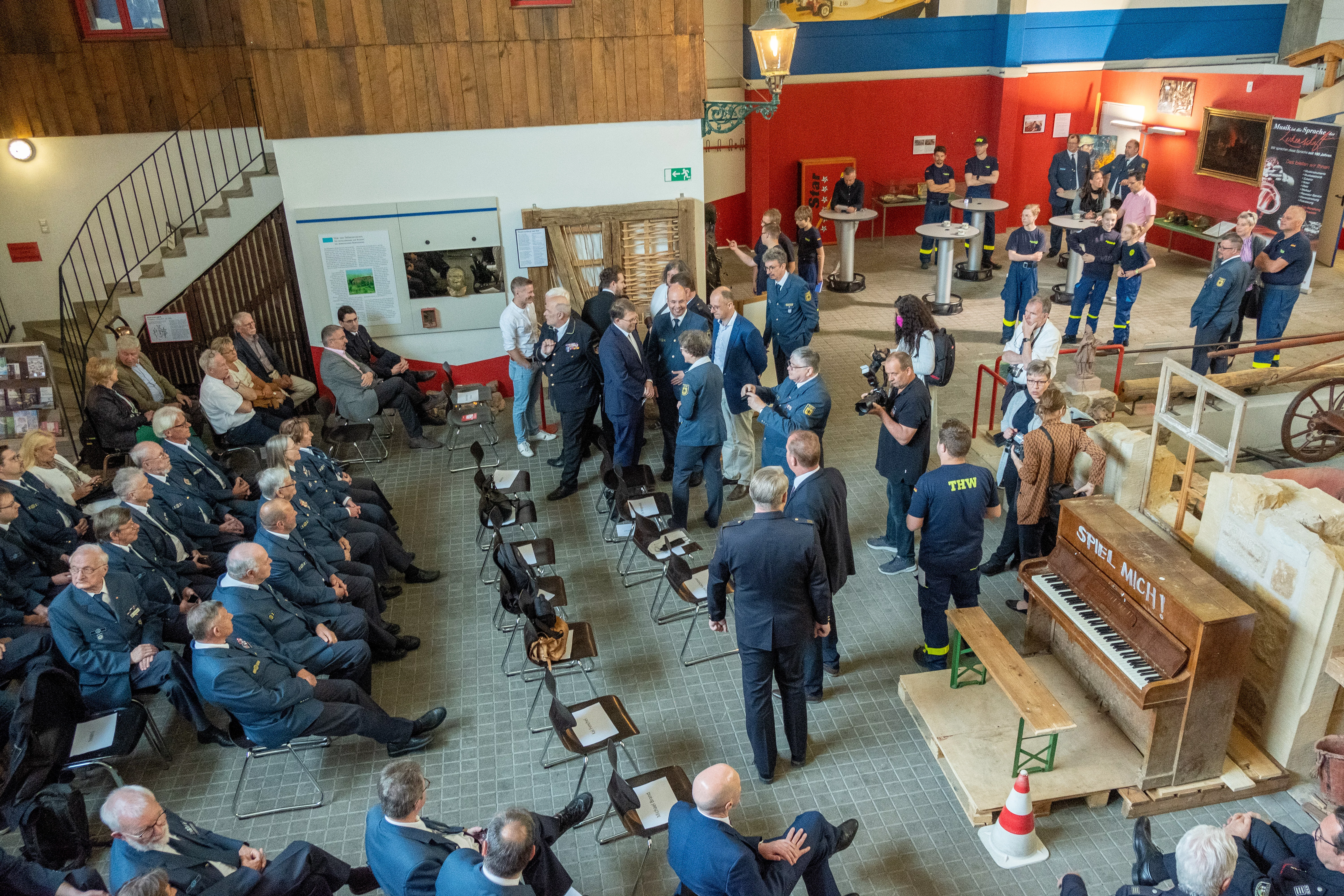 Die Idee das Klavier aus dem Ahrtal zu retten und als Erinnerungsstück und Mahnmal im DFM auszustellen, stammte von der THW-historischen Sammlung und dem Deutschen Feuerwehr-Museum. Umgesetzt haben es die Helferinnen und Helfer des THW zusammen mit Kameradinnen und Kameraden der Feuerwehr. Gemeinsam haben sie das Klavier gerettet, geborgen und an diesen Ort gebracht. Damit wird das „Spiel mich“-Klavier zu einem wichtigen Ausstellungsstück der zukünftigen Sammlung. Es symbolisiert den praktischen Startschuss für das gemeinsame Museum der Deutschen Feuerwehren und des Technischen Hilfswerks.