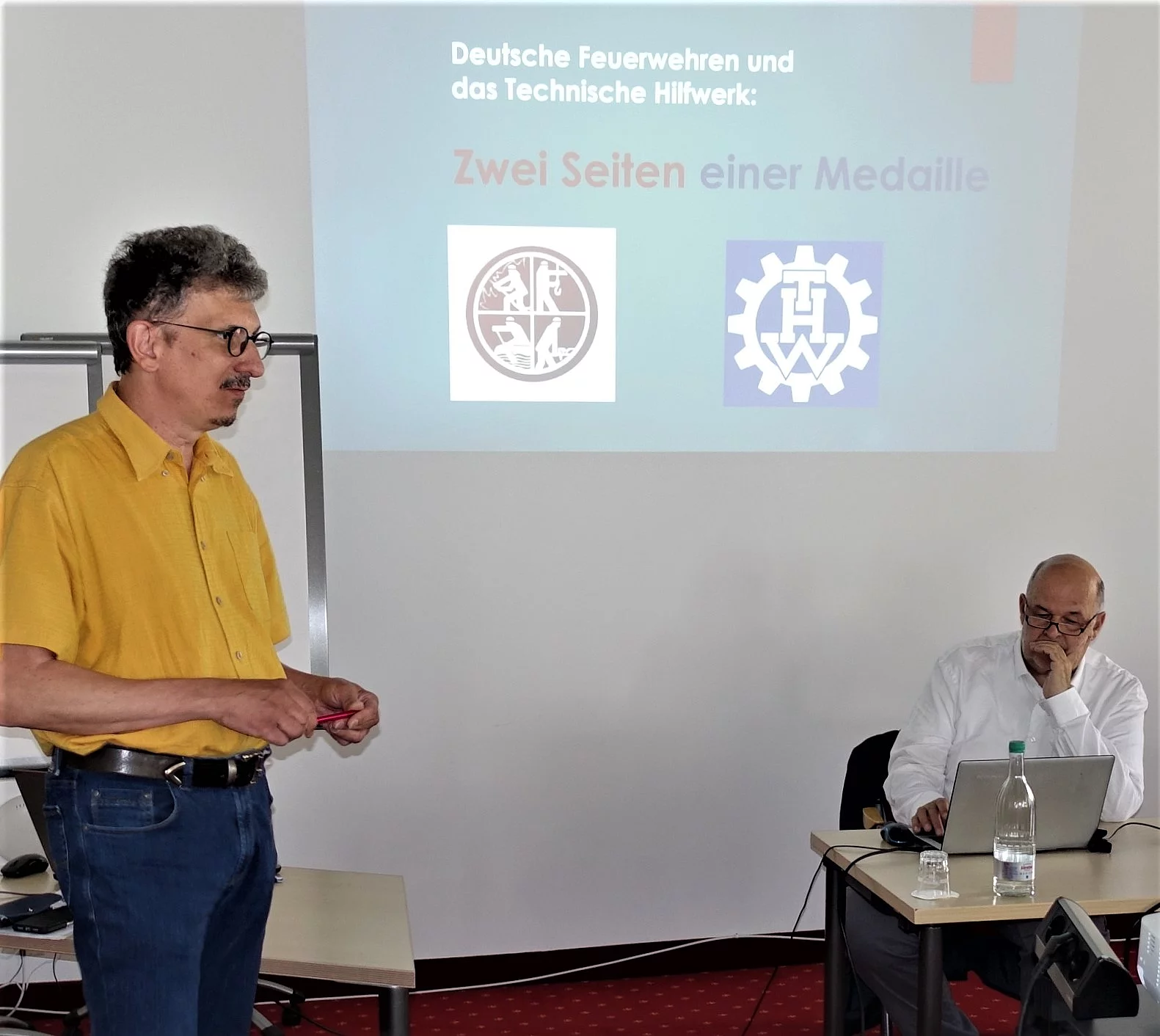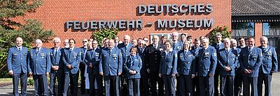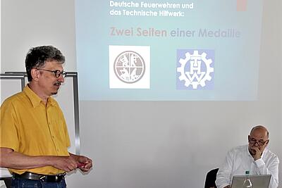 Dr. Heiler übergab das Wort an Rolf Schamberger, Leiter des Deutschen Feuerwehr-Museums und an Bernd Müller-Strauß. Beide stellten das gemeinsame Museumsprojekt der Deutschen Feuerwehren und des Technischen Hilfswerkes vor. In ihrem Vortrag präsentierten sie das Rahmenkonzept sowie die einzelnen möglichen Erzählstränge der Geschichte des Bevölkerungsschutzes. Das Museum ist für 2026 in Fulda geplant.